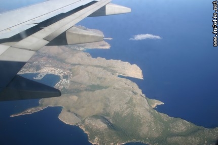 Vol au dessus du nord de l'île avec la pointe qui mène au cap de Formentor et à gauche la baie de Pollença qui baigne la ville de Port de Pollença.